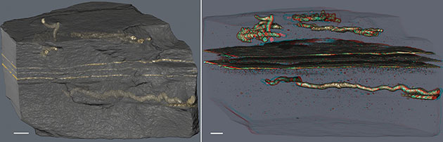 Gefüllt sind sie fadenförmigen Röhren mit Pyrit-Kristallen, die einst durch die bakterielle Umwandlung biologischen Gewebes entstanden waren. Damit, das zeigen die chemischen Analysen, sind sich vom Umgebungsgestein deutlich unterscheidenden Strukturen eindeutig biologischen Ursprungs und zu jener Zeit entstanden, als auch die Sedimente abgelagert wurden.
