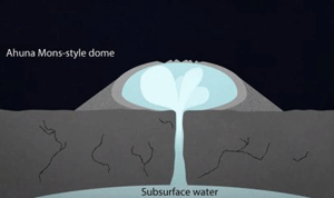 Während die vulkanische Aktivität auf Ceres damit deutlich geringer ist als auf der Erde, wo Vulkane mehr als eine Million Kubikmeter Material pro Jahr erzeugen, sind die Ceres-Eisvulkane auch weniger explosiv als ihre feurigen irdischen Gegenstücke und erzeugen statt explosiver Ausbrüche vielmehr regelrechte Kuppeln aus sogenannter Kryomagma – also einem salzigen Gemisch aus Fels, Eis und anderen flüchtigen Materialien wie etwa Ammoniak. Gelangt dieses nach und nach die Oberfläche gefriert es hier erneut. Die Forscher vermuten, dass die meisten ehemals mächtigen Eisvulkane auf Ceres genau so entstanden sind, bevor sie sich wieder „entspannt“ hatten.