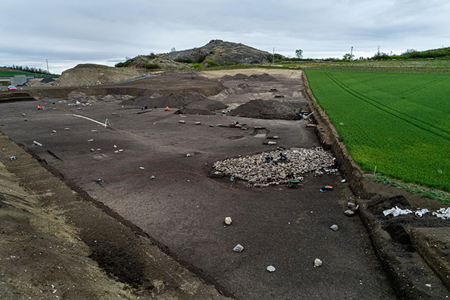 Das Luftbild der Ausgrabungsstätte zeigt das Steinhügelgrab und einige der Menhire.