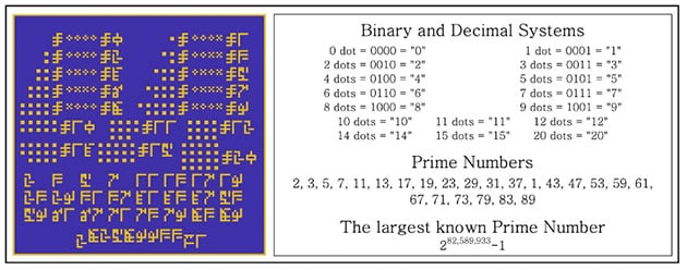 Den Anfang macht die neue, nun aus 13 Teilen bestehende BITG-Botschaft stellt die Zahlen 0 bis 9 sowohl im binären wie auch im Dezimalsystem dar und erklärt zugleich die Beziehung beider Systeme. Der Zahlen-Teil endet mit einer Reihe von Primzahlen (2-89) und der größten uns bislang bekannten Primzahl.