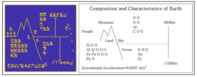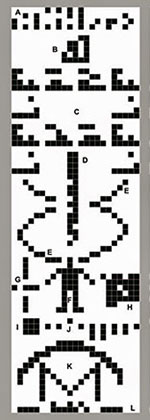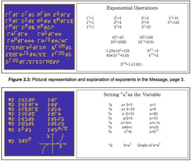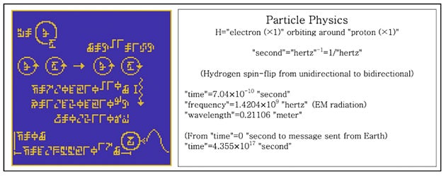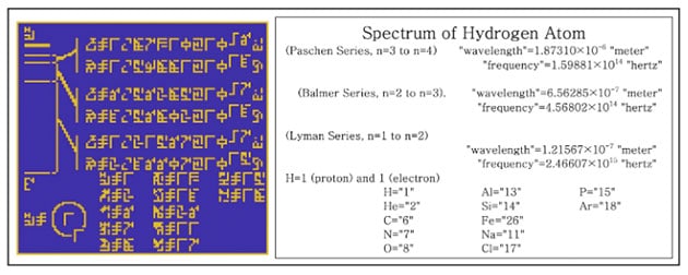Richtig erkannt und angeordnet lassen sich dann – zumindest aus menschlicher Sicht – anhand der sich so ergebenden Abbildung sie Zahlen von 1 bis 10 (A), die Protonenanzahlen der chemischen Elemente Wasserstoff, Kohlenstoff, Stickstoff, Sauerstoff und Phosphor sowie die vier Nukleotide als Bausteine der DNA (B, C, D) und deren Doppelhelix-Struktur (E) ebenso ablesen, wie Basisinformationen über die Menschheit (F,G, H), unser Sonnensystem mit der Erde als Ursprung der Botschaft (j) und abschließend die Art und Weise der Sendevorrichtung selbst (K, L).