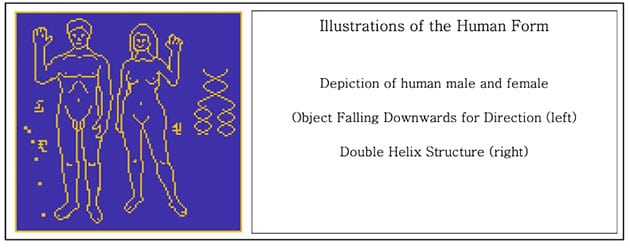 Es folgt eine Abbildung eines Menschenpaares, die sich dessen Darstellung auf einer Plaketten auf den Pioneer-Sonden bedient und von einer visuellen Abbildung der Doppelhelix-Struktur sowie von der richtunggebenden Darstellung eines fallenden Objekts links vom Menschenpaar begleitet wird.