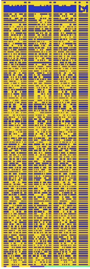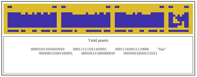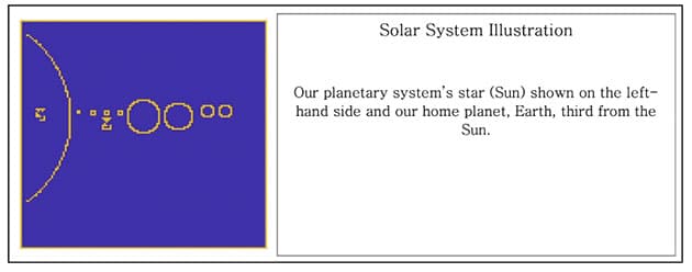 Auch unser Sonnensystem – und darin hervorgehoben der dritte Planet als Ursprung der Botschaft selbst, wird wie schon in der „Arecibo-Botschaft“ binär abgebildet…