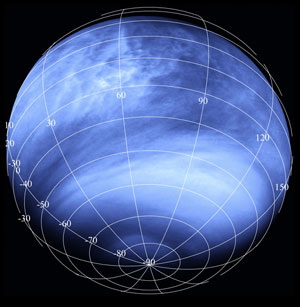 Auch auf dieser Ansicht der Venus im ultravioletten Licht, aufgenommen von der europäischen Sonde “Venus Exress”, sind die bislang unerklärten dunklen Streifen in der Venus-Atmosphäre deutlich zu erkennen.