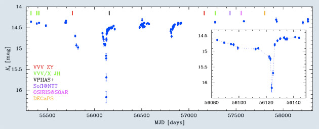 Wie das Team um Roberto Saito von der Federal University of Santa Catarina aktuell vorab via ArXiv.org berichtet, sei auch angesichts des Lichtmusters des Sterns „VVV-WIT-07“ noch nicht klar, was für die beobachteten Abdunkelungen verantwortlich ist: