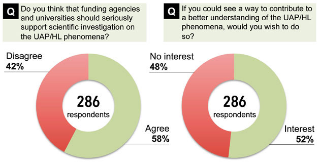 Zwar erhielten Caron und Faridi von nur von 295 der insgesamt 6.049 angeschriebenen Forschern und Wissenschaftlern eine Antwort, wodurch die Teilnahmerate bei gerade einmal knapp 5 Prozent lag. Dennoch zeigten diese Antworten, dass eine Mehrheit von 58 Prozent (165/286) der gültigen Teilnehmer glauben, dass die Erforschung von UAPs/UFPs nicht vernachlässigt werden und stattdessen durch Fördereinrichtungen unterstützt werden sollten.