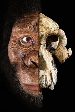 Der 3,8 Millionen Jahre alte fossile Schädel eines Australopithecus anamensis (l.) und die dazugehörige Gesichtsrekonstruktion.