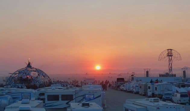 Sonnenaufgang über dem Festivalgelände am Cirque Gitane des „Burning Man“ in Nevada, 2017. Copyright/Quelle: Steve Jurvetson (via WikimediaComons) / CC BY-SA 2.0