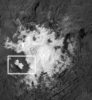 Das Rechteck markiert den obigen Bildausschnitt auf einer älteren, bekannten Ceres-Aufnahme.