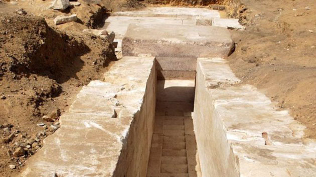 Vor Ort stießen die Wissenschaftler des ägyptischen Antikenministeriums auf einen Stufengang, der zu einem Gänge- und Kammernkomplex im Innersten der einstigen Pyramide führte. Hier versperrt offenbar seit der Grablegung ein gewaltiger, tonnenschwerer Steinblock, den Eingang zu einer Grabkammer.