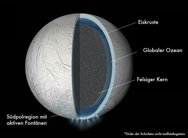 Schematische Darstellung des Inneren Aufbaus des Saturnmondes Enceladus (Illu.).
