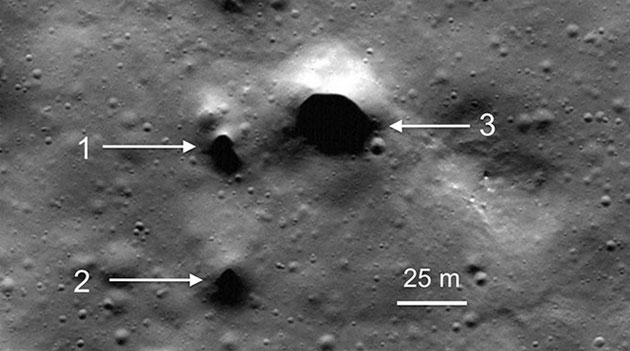Drei Eingänge zu potentiell eisreichen Lavaröhren in der Nähe des Mondnordpols.