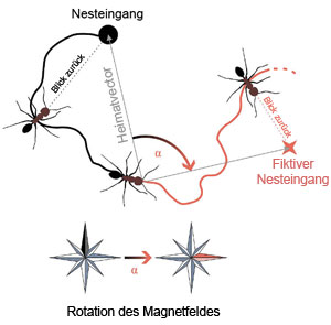 Grafische Darstellung der Suche nach dem Nesteingang. Hierbei orientieren sich Wüstenameisen erfolgreich mit Hilfe des Erdmagnetfelds (schwarz). Das zeigen Experimente, bei denen das Magnetfeld künstlich gedreht wird (rot). (dt. Textübers.: Red. GreWi).