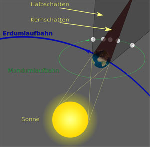 Zu einer Mondfinsternis kommt es immer dann, wenn der Mond in den Kernschatten der Erde tritt (s. Abb.) und der Vollmond eine rötliche Färbung annimmt, weil das langwellige rote Licht der Sonnenstrahlen in der Atmosphäre gebrochen und in Richtung unseres Trabanten gelenkt wird, während die kurzwelligen blauen Lichtwellen vollständig in der Erdatmosphäre gestreut werden.