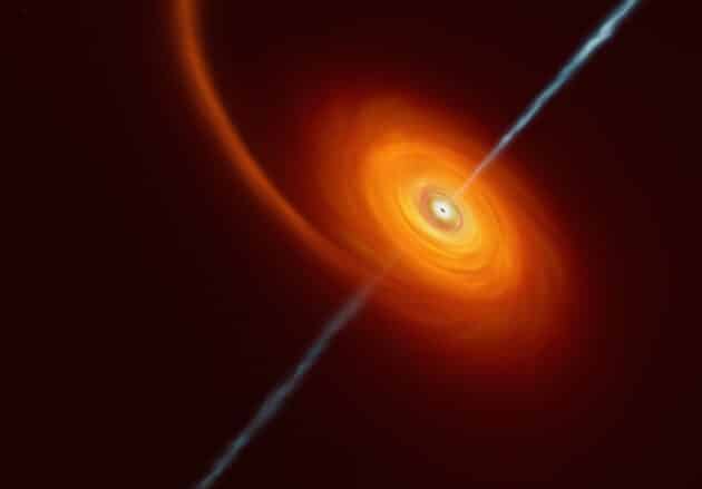 Sterne, die zu nahe an ein schwarzes Loch herankommen, werden durch die enormen Gezeitenkräfte des schwarzen Lochs auseinandergerissen, was als Tidal Disruption Event (TDE, Gezeitenstörung) bezeichnet wird. Bei etwa 1 % dieser Ereignisse werden Plasma- und Strahlungsjets von den Polen des rotierenden schwarzen Lochs ausgestoßen. 1971 stellte der Pionier der schwarzen Löcher, John Wheeler, das Konzept der Gezeitenstörung als „eine Zahnpastatube, die man in der Mitte fest zusammendrückt“ vor, wodurch das System „Materie aus beiden Enden ausstößt“. (Quelle: ESO)