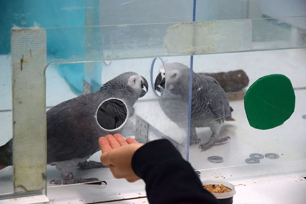 In den vorangegangenen Experimenten hatte etwa das Graupapageien-Weibchen Bella gelernt, metallene Wertmarken gegen eine Futterbelohnung eintauschen zu können, während sie in einer Plexiglas-Kammer sitzt. Einziges Problem und Interesse der beobachteten Forscher: Das Loch in dieser Kammer, durch das der Tauschhandel stattfindet, wurde versperrt. In der direkt benachbarten Testkammer allerdings wartete ihre Freundin Kimmi, deren Öffnung für den Austausch Marke gegen Futter ist offen. Aber Bella sieht, dass Kimmi keine Wertmarken bekommt. Was wird sie tun?