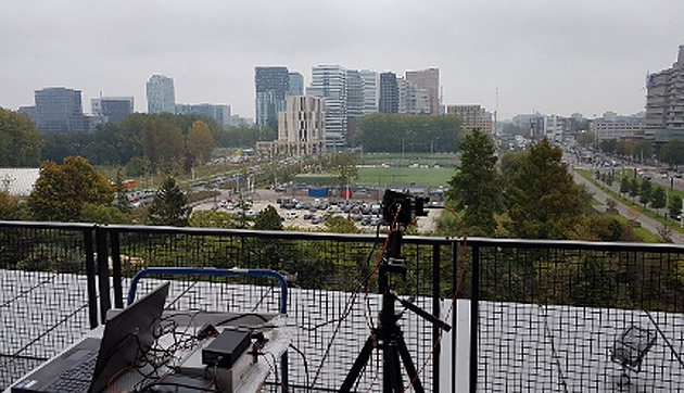 Das „TreePol“-Instrument im Einsatz auf dem Dach der Vrije Universiteit Amsterdam. Hier unterschied das System erfolgreich Kunstrasenflächen von nahen und fernen Bäumen in der Umgebung.