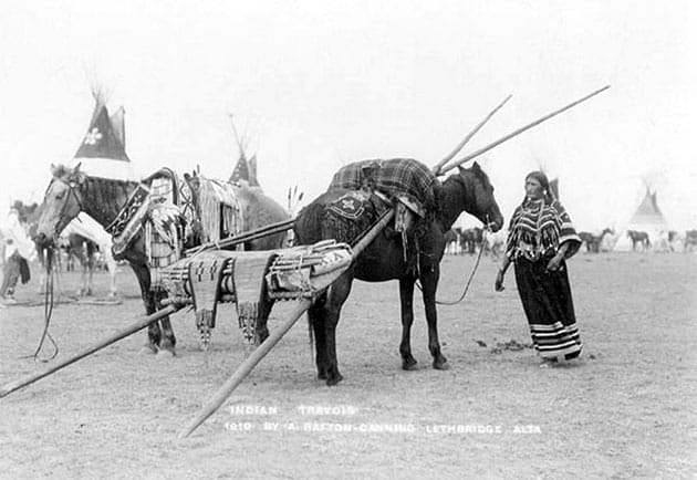 Transportmittel, die auf diese Weise aus Stangen gefertigt wurden, sogenannte Stangenschleifen, sind auch als ‚Travois‘ bekannt.