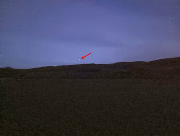Eine 60-jährige Zeugin beobachtete während eines Spazierganges ein ungewöhnlich helles Licht am Himmel, das über einen längeren Zeitraum über dem Horizont sichtbar blieb. Sie fotografierte das Phänomen, brach ihre Beobachtung jedoch nach etwa 10 Minuten ab.