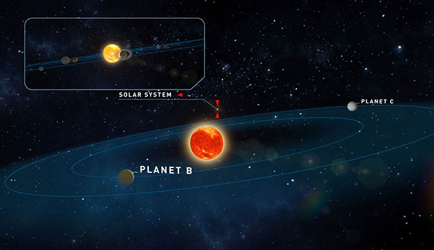 Teegardens Stern und seine beiden Planeten, im Hintergrund unser Sonnensystem (Illu.).
