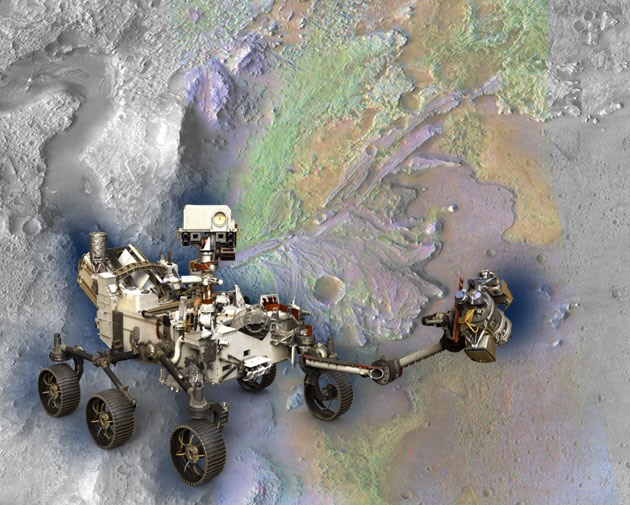 Der Mars-Rover „Perseverance“ (Illu.) vor dem Hintergrund seines vorgesehenen Lande- und Arbeitsortes, dem Jezero-Krater. Copyright: grewi.de (mit Materialien von NASA/JPL-Caltech/ASU)