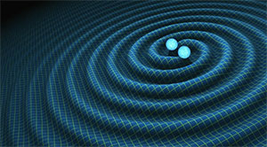 Computersimulation der von zwei sich umkreisenden Schwarzen Löchern ausgelösten Gravitationswellen in der Raum-Zeit (Illu.)Copyright: LIGO