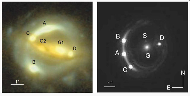 Die beiden in dieser Studie verwendeten Gravitationslinsensysteme B1608+656 und RXJ1131. Die Buchstaben A bis D bezeichnen die verschiedenen Bilder des Hintergrundquasars, G1 und G2 sind links die Linsengalaxien, G ist rechts die Linsengalaxie mit einer Satellitengalaxie S.