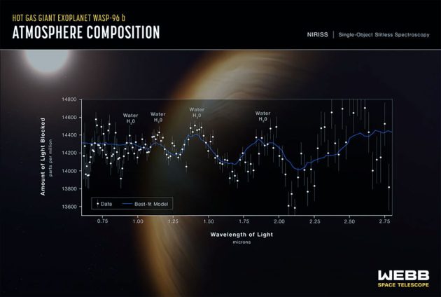 „Das Spektrum von WASP-96 b mittels NIRISS ist nicht nur die bislang detaillierteste Spektralanalyse im nahen Infrarot, die bislang von der Atmosphäre eines Exoplaneten ermittelt wurde, sie deckt auch eine erstaunlich weiter Bandbreite an 280 individuellen Wellenlängen ab, darunter sichtbares rotes Licht und einen Teil des Spektrums, das von früheren Teleskopen bislang nicht abgedeckt wurde“, erläutert die NASA-Presseinformation.
