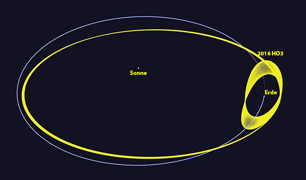 Der Asteroid “2016 HO3” begleitet die Erde fortwährend auf einer nahezu konstant gleichen Umlaufbahn um die Sonne (Illu.).