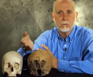 Lloyd Pye (1946-2013) mit dem „Starchild-Schädel“ und einem gewöhnlichen Menschenschädel.