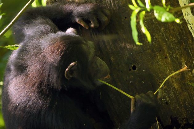 Schimpansen sind dafür bekannt, verschiedene Werkzeuge zu benutzen. Scharfe Steinwerkzeuge gehören jedoch nicht dazu. Copyright/Quelle: Kevin Langergraber / Universität Tübingen