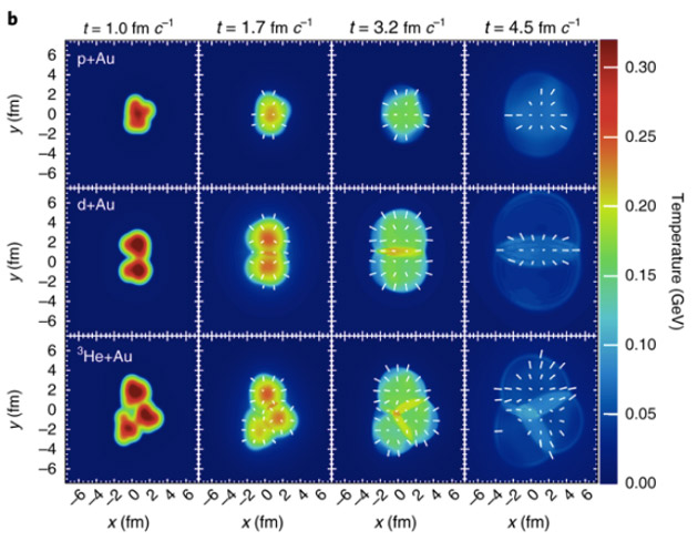 Tatsächlich belegte das PHENIX-Experiment nun genau dies: „Kollisionen von Deuteronen bildeten kurzlebige Ellipsen, Helium-3-Atome bildeten Dreiecke und ein einziges Proton explodierte in Form eines Kreises“ (s. Abb.).