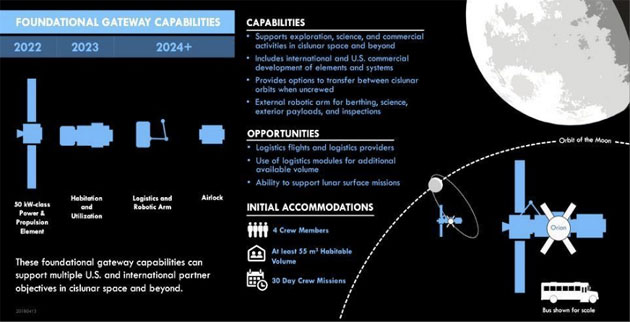 Der Schlüssel zur Einrichtung der ersten US-amerikanischen Infrastruktur um und auf dem Mond stelle dabei das sogenannte Gateway dar – eine Station auf einer Mondumlaufbahn, von der aus Astronauten die weitere erdferne Erforschung aufnehmen sollen.
