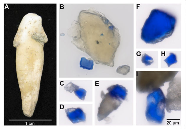Analysen der Partikel zeigten, dass es sich um Pigment handelt, das einst aus Lapislazuli hergestellt worden war. „Wir haben viele Szenarien durchdacht, wie dieses Mineral in den Zahnstein dieser Frau gelangt sein könnte“, erklärt die Mitautorinnen Anita Radini und Monica Tromp vom Max-Planck-Institut für Menschheitsgeschichte und ergänzen: „Basierend auf der Verteilung des Pigments in ihrem Mund kamen wir zu dem Schluss, dass es am wahrscheinlichsten ist, dass sie selbst mit dem Pigment malte und die Pinselspitze beim Arbeiten immer wieder anleckte.“