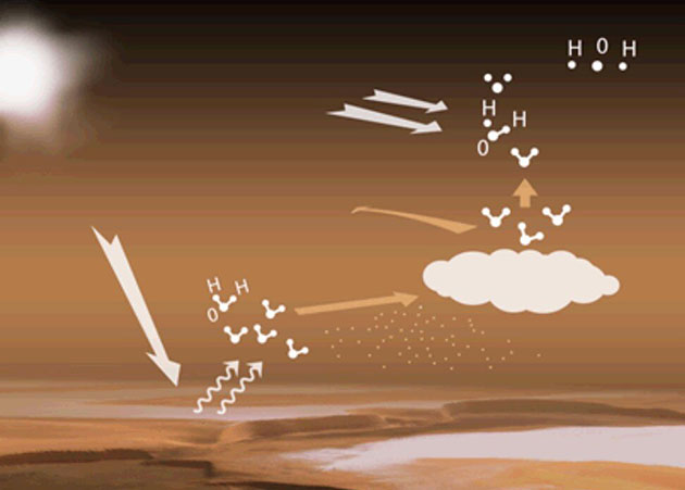„Der stetige Verlust von Wasser (H2O) passiert in der oberes Marsatmosphäre in etwa 80 Kilometern Höhe, wenn die UV-Strahlung und andere chemische Vorgänge die Wassermoleküle in Wasserstoff- und Sauerstoffatome auftrennen und die schwache Gravitation des Planeten diese nicht mehr davon abhalten kann, ins All zu entweichen.“