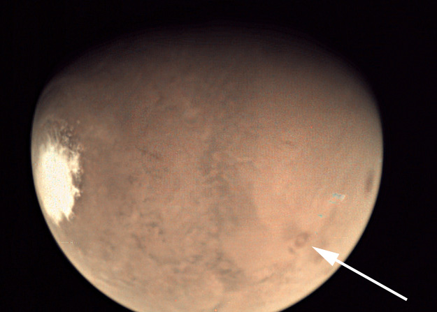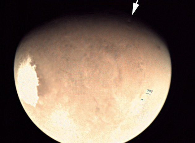 Mars-Webcam VMC zeigt rätselhafte Wolkenfahne über Mars-Vulkan