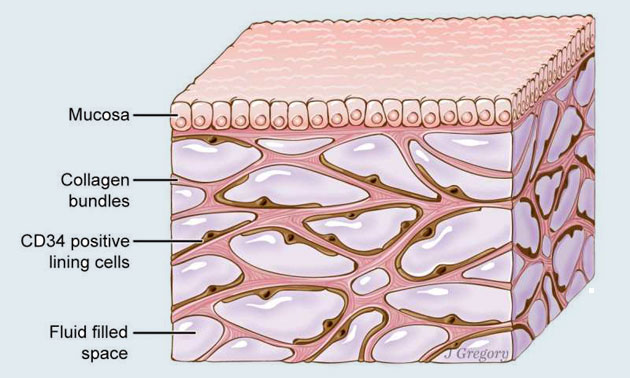 Bei genauerer Betrachtung zeigte sich, dass es sich bei dem Verbindungsgewebe tatsächlich um einen „offene, mit Flüssigkeit gefüllten Raum handelt, der von dicken Kollagensträngen gestützt wird und so ein den gesamten Körper durchziehendes Netzwerk darstellt, dass die Organe wie ein Kissen vor äußerlichen Stoß- und Bewegungseinwirkungen schützt“, so die Autoren des Fachartikels.