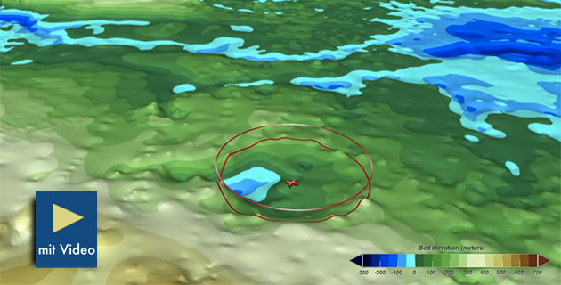 Visualisierung der Satellitendaten zum zweiten Einschlagskrater unter der Eisdecke Grönlands.