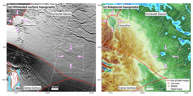 Erst im vergangenen November berichteten Wissenschaftler von der Entdeckung eines 31 Kilometer durchmessenden Kraters unter dem Hiawatha-Gletscher im Nordwesten Grönlands (…GreWi berichtete).