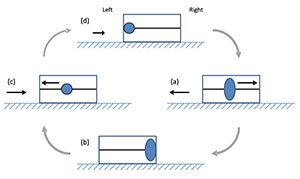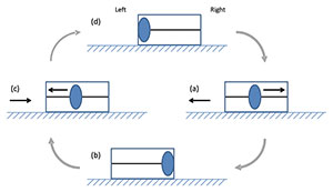 Das von Burns angedachte Konzept kann anhand eines Gedankenexperiments in Form einer Kiste beschrieben werden, die auf auf einer reibungslosen Oberfläche beweglich aufliegt. Im Innern dieser Kiste befindet sich ein Stab entlang dessen sich ein Ring hin- und her bewegen kann. Angestoßen von einer Sprungfeder, gleitet der Ring entlang des Stabes in eine Richtung, während die Kiste selbst sich in die andere Richtung bewegt. Erreicht der Ring das Ende der Kiste, so gleitet er zurück und die Kiste kehrt an ihren Ausgangspunkt zurück, und das Spiel beginnt erneut (s. Abb. l.; Copyright/Quelle: Burns, 2019). Bislang folgt dieses Prinzip noch dem Prinzip von Actio und Reactio, Handlung und Wirkung gemäß dem dritten Newtonschen Gegenwirkungsprinzip, weshalb unter gewöhnlichen Bedingungen die Kiste nur hin und her rückt, ohne sich wirklich fortzubewegen.