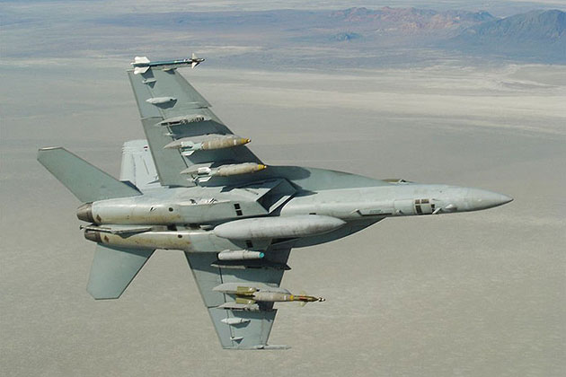 Ein Rayethon-System „Advanced Targeting Forward Look Infrared Sensor“ (ATFLIR), wie er angeblich auch im Fall der UFO-Begegnung der USS Nimitz 2004 zum Einsatz kam, ist unter dem unteren Flügel des hier abgebildeten Kampjets zu erkennen (hellblaue Kappe).