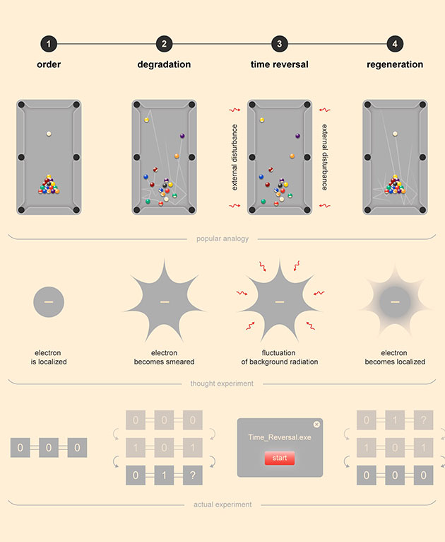 „Aber Schrödingers Gleichung ist umkehrbar“, erläutert Valerii Vinokur vom Argonne National Laboratory und einer der Mitautoren des Fachartikels. „Bei einer bestimmten mathematischen Transformation, der sog. komplexen Konjugation, kann die Gleichung deshalb beschreiben, wie sich das so unscharf gewordene Elektron wieder auf einen lokalisierten Punkt zurückzieht.“