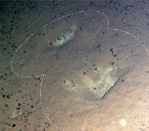 Direkte Nahaufnahme zweier Abdrücke im Meeresboden. Die gestrichelte Linie verweist auf jene Region, in der sich durch den Aushubprozess aufgewirbelter Boden und andere Sedimente auf dem Untergrund abgesetzt haben.