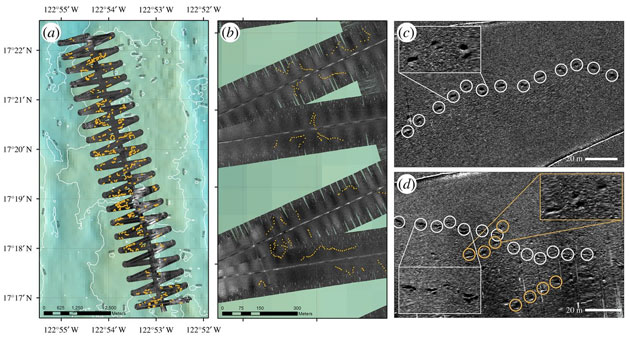 Hier stieß ein Erkundungs-Tauchroboter auf mehr als 3.500 der durchschnittlich knapp 2,5 Meter langen und rund 13 Zentimeter tiefe Abdrücke im Boden. Die Sonaraufnahmen zeigen, dass diese Abdrücke auch nicht zufällig verteilt sind und leicht kurvig verlaufende Spuren bilden, wie sie die Forscher um Marsh „fasst schon an eine Reihe von Fußspuren“ erinnern (s. Abb.). Eine Spur besteht demnach aus jeweils etwa 21 „Stapfen“, die zwischen 6 und 13 Metern auseinander liegen. Zwar seien die Abdrücke offenbar unterschiedlich alt, es scheine sich aber um Spuren aus jüngerer Zeit zu handeln.