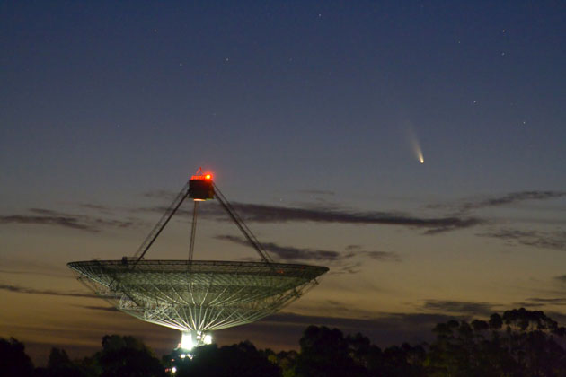 Das Parkes Radio Telescope blickt in den Himmel. Mit im Bild (r.) zu sehen ist der Komet Komet PanSTARRS (C/2011 L4).