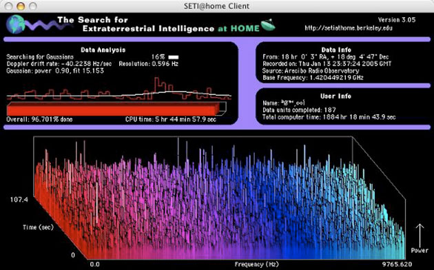 Von der University of California in Berkeley am 17. Mai 1999 gestartet, wurde SETI@home schnell zu einem der beliebtesten Volunteer-Computing-Projekte überhaupt. Während zunächst nur Signale an die Nutzer weitergereicht wurden, die bei den normalen astronomischen Beobachtungen mit dem Radioteleskop Arecibo auf Puerto Rico gewonnen wurden, kamen Daten des Green Bank Telescope in West Virginia und des australischen Parkes-Observatorium hinzu. Entsprechende Daten werden in kleine Einheiten verpackt und an jene via Internet verbundenen Heimnutzer verteilt, die die Software in Form eines Bildschirmschonerprogramms heruntergeladen und zu Computerbetriebszeiten mittels ungenutzter Rechenkapazität des heimischen PCs auswerten und danach wieder zur Zentrale in Berkeley zurücksenden.