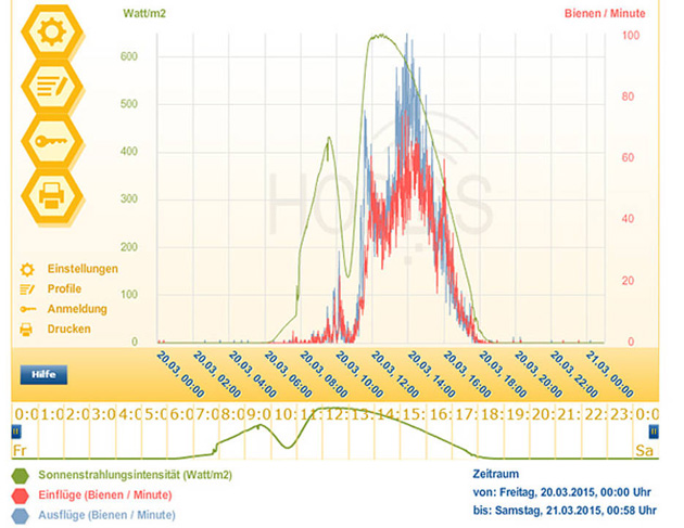 In den Imker-Fachzeitschriften „die biene“, „ADIZ“ und „Imkerfreund“ wertete damals der Fachjournalist Gilbert Brockmann die Daten des HOBOS-Bienenvolks zu Ein- und Ausflügen der Bienen pro Minute, Umgebungstemperatur, Intensität der Sonnenstrahlung während der Sonnenfinsternis am 20. März 2015 aus.
