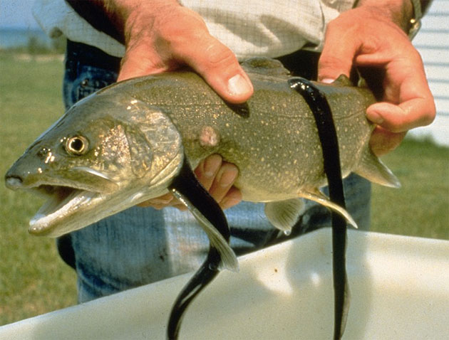 Zwei Meerneunaugen an einer Amerikanischen Seeforelle.