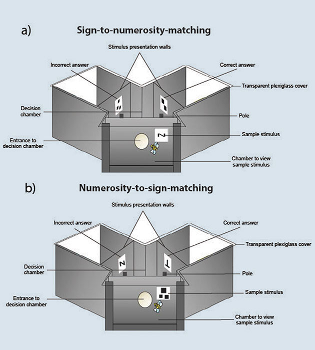 Im Experiment wurden einzelnen Honigbienen (Apis mellifera) darin trainiert, in einem Y-förmigen Labyrinth, ein Symbol korrekt mit Zahlenelementen in Übereinstimmung zu bringen. Anschließend wurde geprüft, ob die Tiere ihr neues Wissen anwenden können, um das Symbol mit verschiedenen Elementen derselben Menge abzustimmen (Beispiel: „2“ wie zwei Bananen, zwei Bäume oder zwei Hüte darstellen kann). Eine zweite Bienen-Gruppe wurde im umgekehrten Ansatz trainiert, indem sie eine Reihe von Zahlenelementen mit einem Symbol verbunden werden sollte.