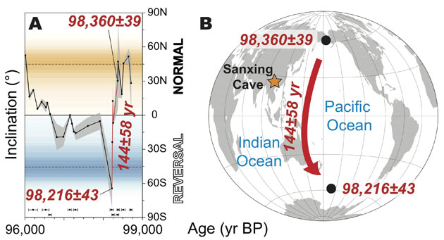 Auf diese Weise gelang es den Wissenschaftlern die magnetische Ausrichtung der Mineralien und damit jene des Erdmagnetfeldes über einen Zeitraum vor 91.000 bis 107.000 Jahren zu bestimmen.
